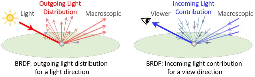 - Distribution: given an incoming light direction, describes how the radiant energy is DISTRIBUTED, after the light bounces back from the surface, over the entire hemisphere as viewed from all the outgoing view directions (total outgoing radiant energy is no greater than the incoming energy hence respecting the law of Conservation of Energy)