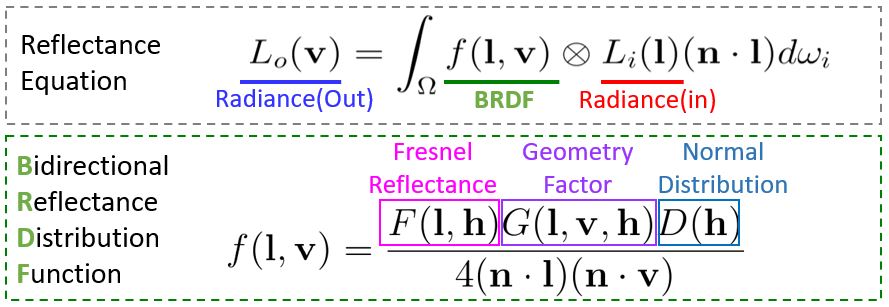 The Reflectance equation gives the amount of output radiance received (how much light viewed) at a particular view direction, given a point on a lit surface, with the input radiance sources of lights coming from all directions integrated over the entire local hemisphere. The BRDF kernel in the integral dictates the exact apperrance by considering the physically based modules of Fresnel Reflectance, Geometry Factor and Normal Distribution. Each word in BRDF bears important connotations as below: