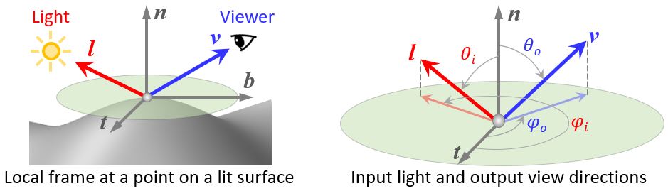 The local coordinate frame of normal, tangent and bitangent vectors at a point on a surface being lit by the light vector and viewed from the view vector. The light vector and view vector will becomes the input and output directions respectively in the reflectance equation and the BRDF formulation later.