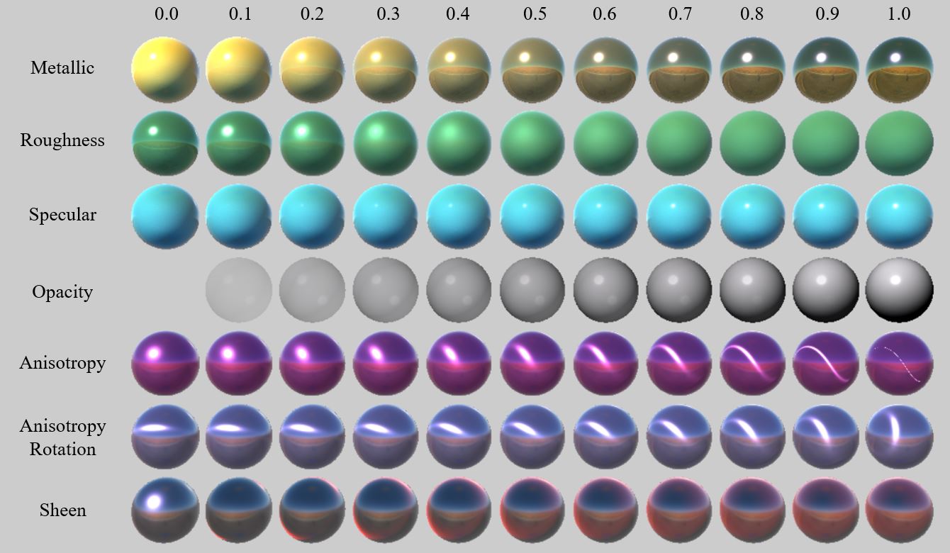 Variational effects visualization of the core PBR parameters of: metallicness, roughness, specular, anisotropy and anisotropy rotation.