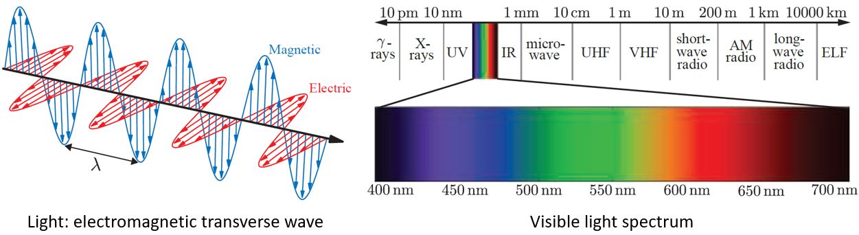 Light as an electromagnetic transverse wave. The range of visible light wavelength is a tiny span on the entire spectrum. Images courtesy of Naty Hoffman's notes.