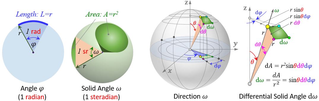 As an important physical concept in both radiometry and photometry, solid angle (unit: steradian) is the 3D analogy of angle (unit: radian). The differential solid angle formula is derived in the figure to the right.