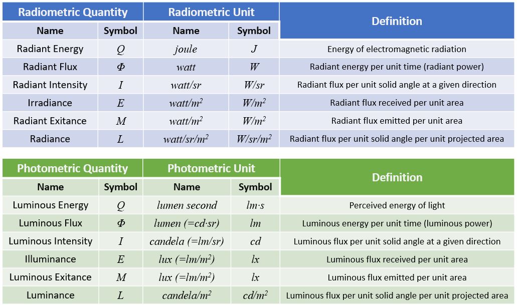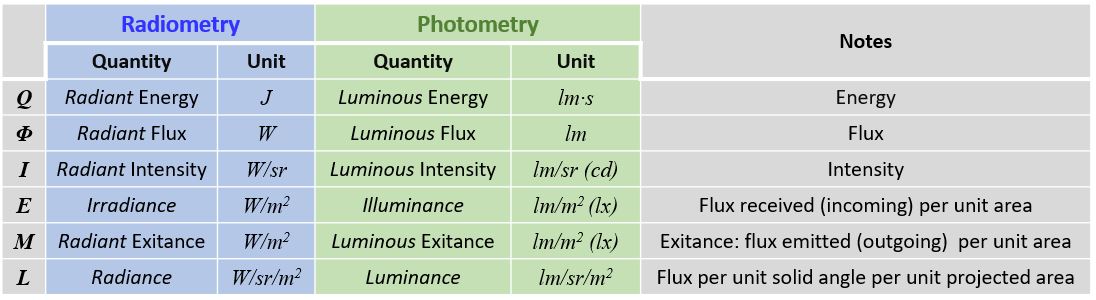 Key physical concepts and quantities in radiometry and photometry for real-time rendering.