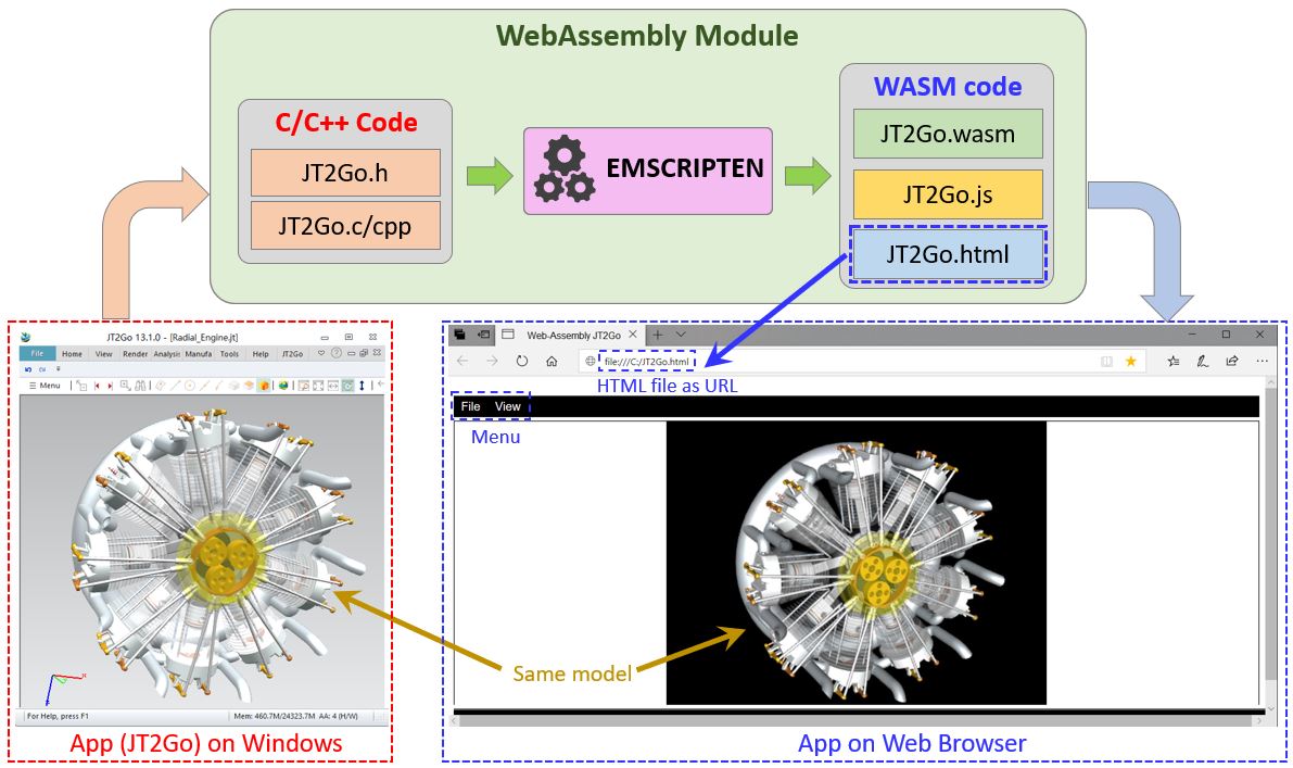 A Windows application JT2Go is able to run on a web browser through the Web-Assembly (WASM) module, which uses the Emscipten compiler to turn the C/C++ code into WASM code consisting of html, js and wasm files. The web app is able to perform the same rendering task of loading a model. The radial engine object courtesy of JT Open models.
