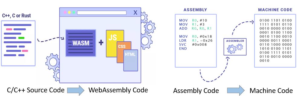 C/C++ source code compiled into WASM code, which in turn into machine code. Images courtesy of Milica Mihajlija.