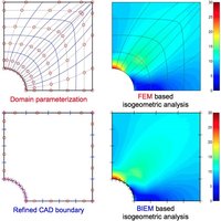 等几何分析(Isogeometric Analysis 或 IGA)用表达几何形状的基函数来拟合物理场;即几何模型和物理分析使用同一基函数,故而得其名。该计算方法实则计算机辅助设计(Computer-Aided Design 或 CAD)和有限单元分析法(Finite Element Analysis 或 FEA)的进一步紧密结合,极大地缓解了需要转化CAD几何模型为适宜分析模型的压力。 由于非均匀有理B样条曲线(Non-Uniform Rational B-Splines 或 NURBS)是CAD系统的标准几何形式,几何模型可以由NURBS的基函数精确表示。无数的收敛实验显示:基于NURBS基函数的有限元分析相比传统的拉格朗日基函数具有相当突出的计算优势。相比IGA来说,传统的有限元分析的劣势显而易见,除了使用拉格朗日基函数以外,几何模型内部参数化也十分复杂耗费资源。考虑到表面或者边界的参数化容易许多,我们研究了如何使用边界积分法(Boundary Integral Equation Method 或 BIEM)结合等几何分析的NURBS基函数来避免内部参数化。实例表明,基于边界积分的等几何分析进一步提升了计算效率,并且十分适合用于形状优化。