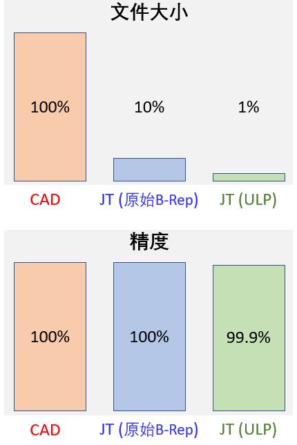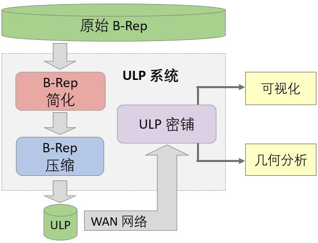完整的B-Rep数据结构在实际应用中因为其复杂度常常会占用很大存储空间,即便对于已经很轻量的几何格式 JT 亦是如此。因此开发出超轻量精确(ULP)的B-Rep格式,通过一些列边界表达简化,数据压缩和密铺技术来达到精简储存的目的。ULP 格式通常只占原有B-Rep格式文件的1%左右,但是其精确度相差无几可以达到99%。这种轻量有相当精确的特性使得ULP成为高效实时渲染以及网络协作可视化应用的理想选择。