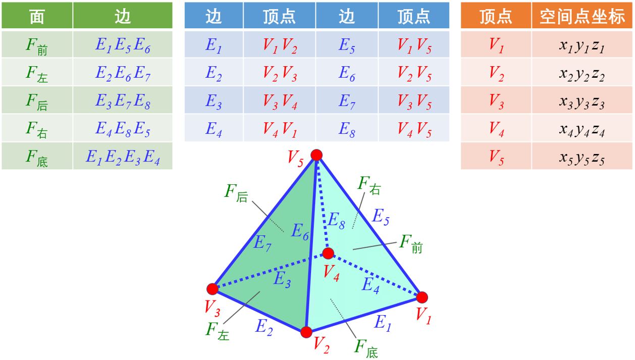 边界表达(B-Rep)是目前工业界CAD/CAM领域最常见的实体建模方式之一。其基本理念是任何空间三维物体都可以看作是由一系列曲面包围而形成,而这些边界曲面则刚好可以用来表达三维实体。以上图中棱锥体为例,它由5个面(绿色)包围而成;每个面又由一些棱边(蓝色)包围;每条棱边有由两个顶点(红色)定义。因此该棱锥体的边界表达则由这些“面-边-顶点”关系的表格共同定义。