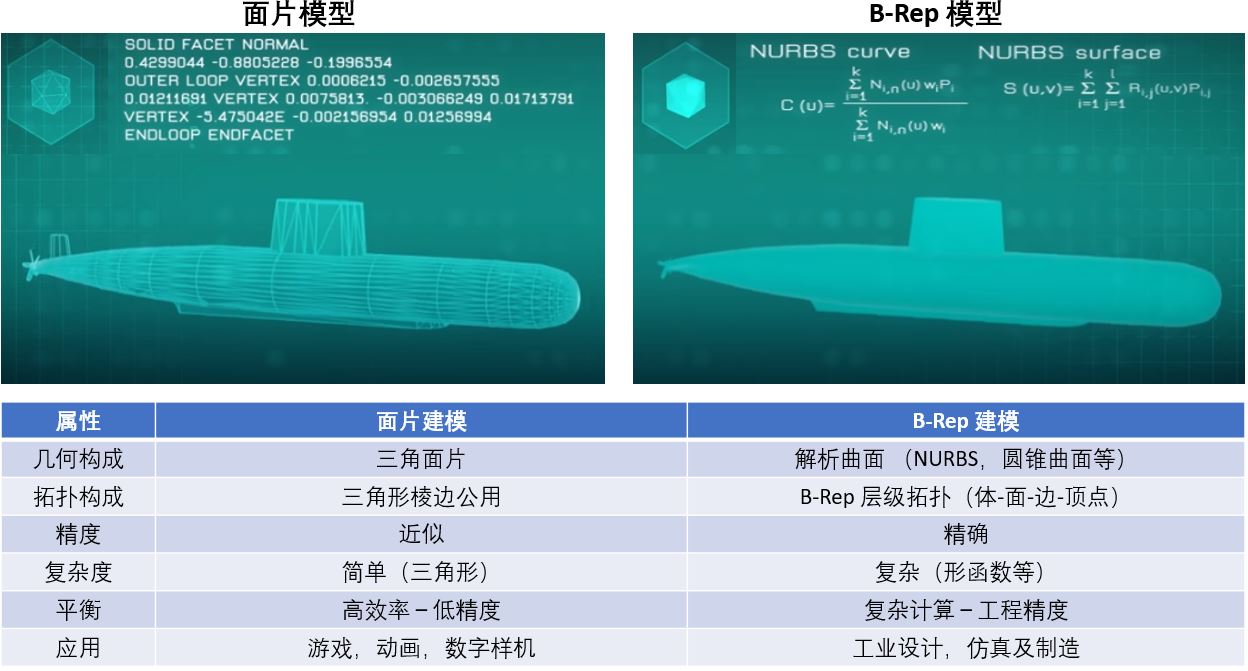 传统意义上的B-Rep模型通常指代连续光滑的解析几何模型,即所谓传统B-Rep模型。随着3D扫描仪普及,面片模型(包含大量三角形的网格)也变得更加普遍。两种模型各有优劣,而因此经常需要进行互相转化;他们各自的优缺点和特性在上图表中列出。