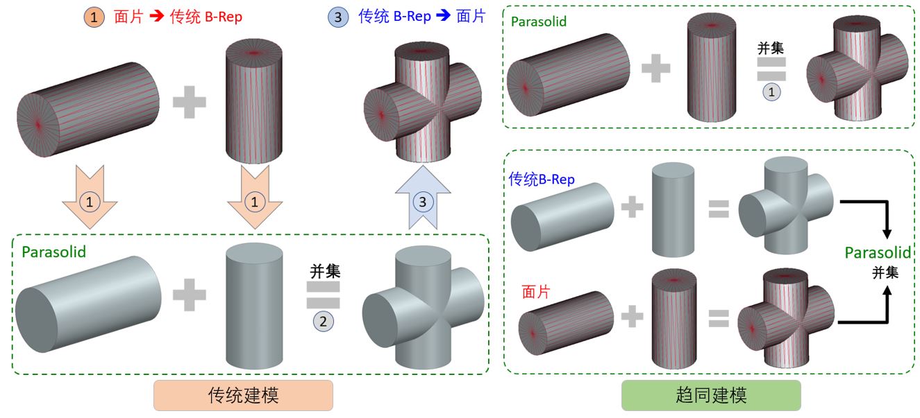 由于两种模型互相转化的过程十分复杂耗时,Parasolid推出趋同建模的概念,即其函数库可以直接作用于面片模型而无需先转化为传统的B-Rep模型。从用户的使用角度来说,两种不同的几何模型都可以使用相同的函数功能,因此称之为“趋同”建模。上图以实体布尔运算为例描述了趋同建模相比传统建模之过程的简化。