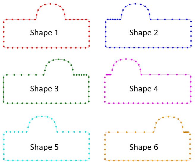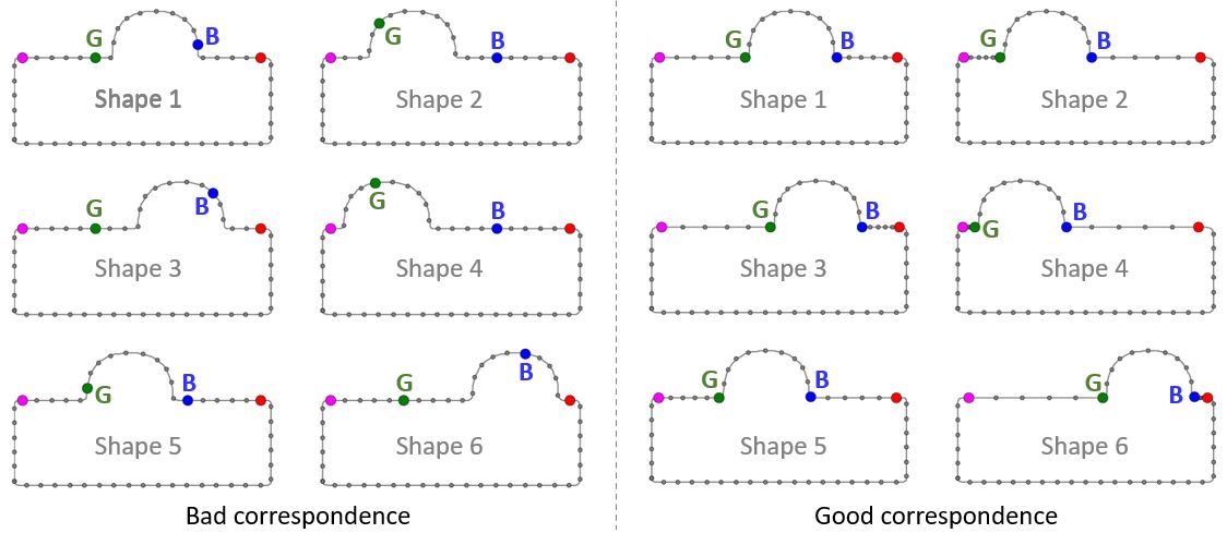 显然,不同的采样方式会生成不同的SSM,而且采样状态本身就定义了组内各形状之间的几何特征是如何一一对应的,即“形状对应”。上面显示了两种不同采样的方式,也即两种不同的形状对应状态。直观上能判断出,左边的对应状态差,右边的好。观察绿色和蓝色的指示点就容易看出,左边的对应中,凸起半圆的两端角落根本没有对应起来,而右边则是十分整齐的对应着。