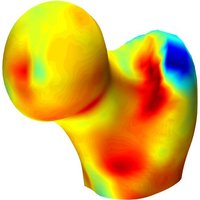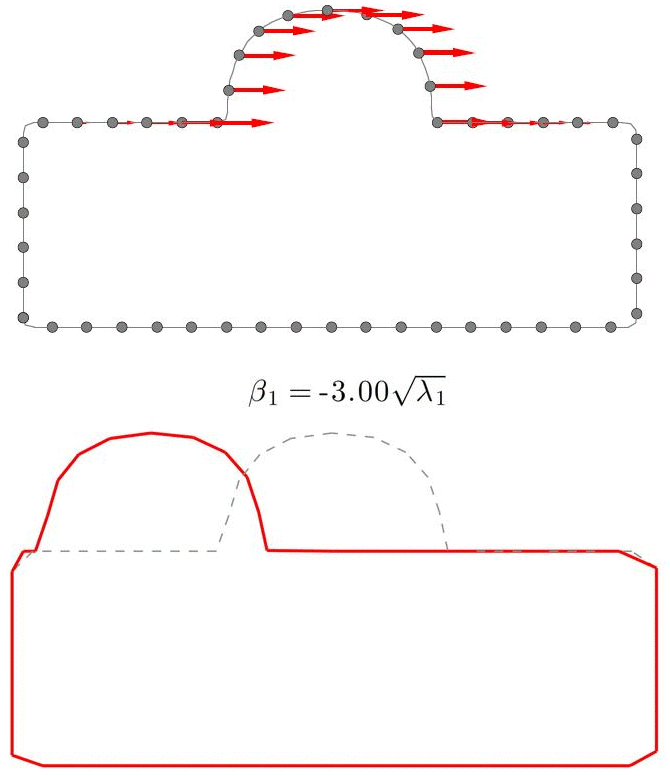 为了获得一组形状(训练集)的统计模型,需要在所有形状上采同样数目的点,算出协方差矩阵,然后得到统计模型,即平均值形状和各模态。上图为一种采样方式的50个点所生成的统计模型,可见其模态1为凸起水平位置的变化。