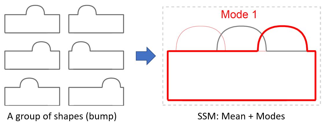 一组形状的统计模型(SSM)的基本含义如上图中的简单例子所示。假设有一组形状,唯一的区别就是半圆形凸起在上边的水平位置不同。如果有右上图中的统计模型,其模态1刚好捕捉到此水平位置变化模式,则组内任意形状都能很容易很方便地由此统计模型表示。