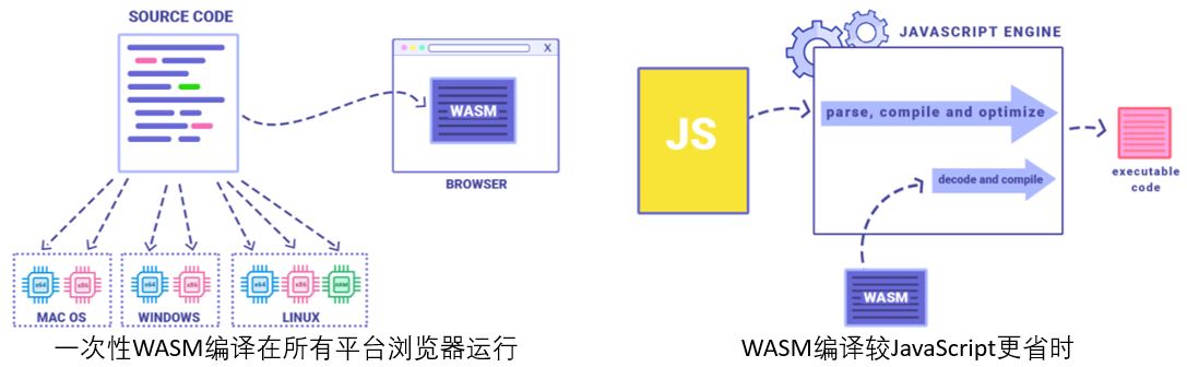 以往,源代码需要在不同平台上分别编译运行,而用WASM只需要编译一次即可在任意平台的浏览器中直接运行。并且WASM编译比传统的Javascript编译省时。