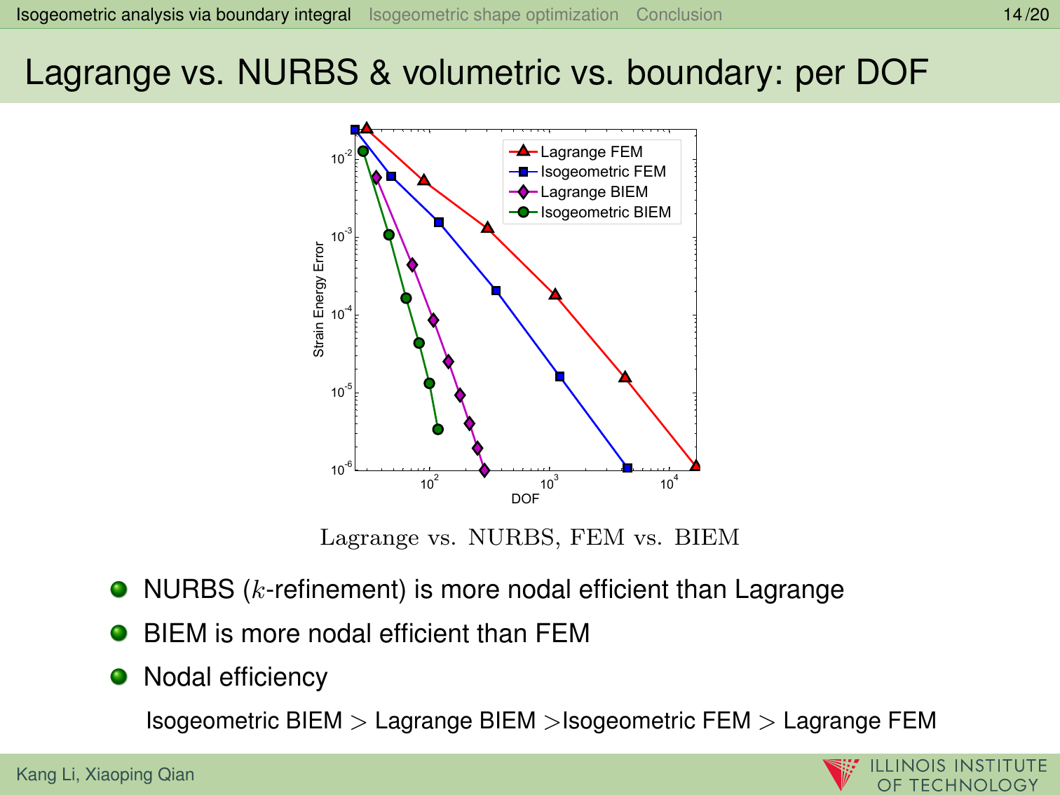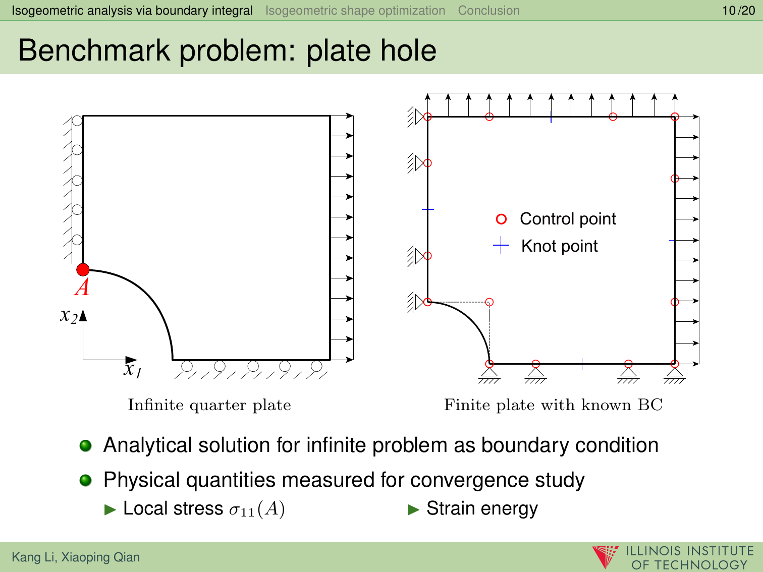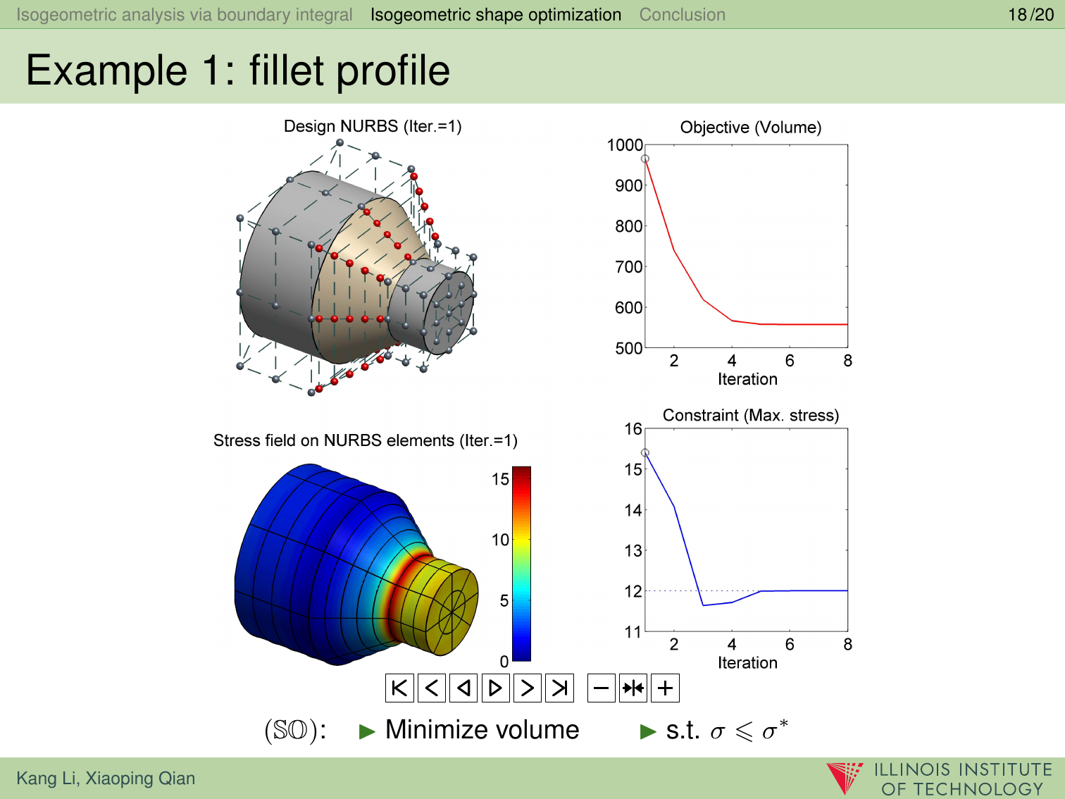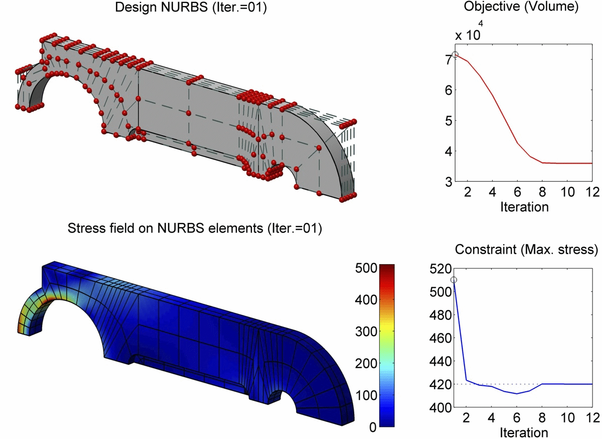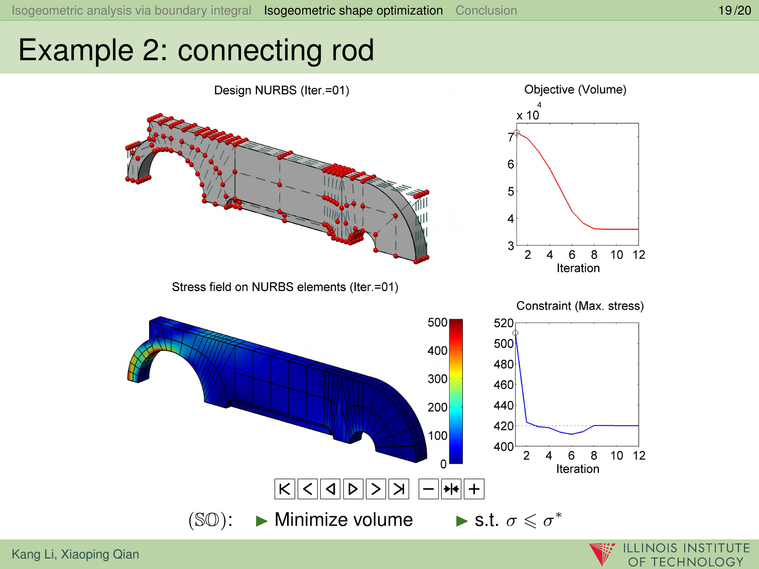如上图所示,文中提出的基于边界积分公式(Boundary Integral Equation 或 BIE)的等几何分析方法(IsoGeometric Analysis 或 IGA)用于求解轴向承重的连杆形状优化问题。模型的边界由22块NURBS曲面片构成,共划分为382个NURBS边界单元。在经过优化求解的22次迭代历之后,连杆体积达到最小值,同时所受最大应力也从510Mpa降至420Mpa。