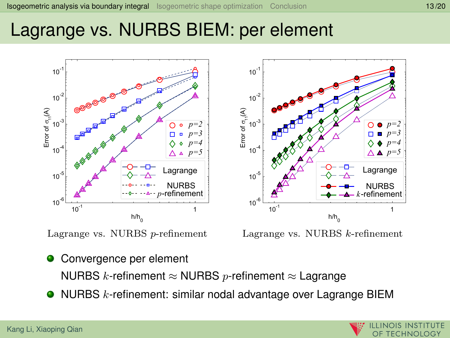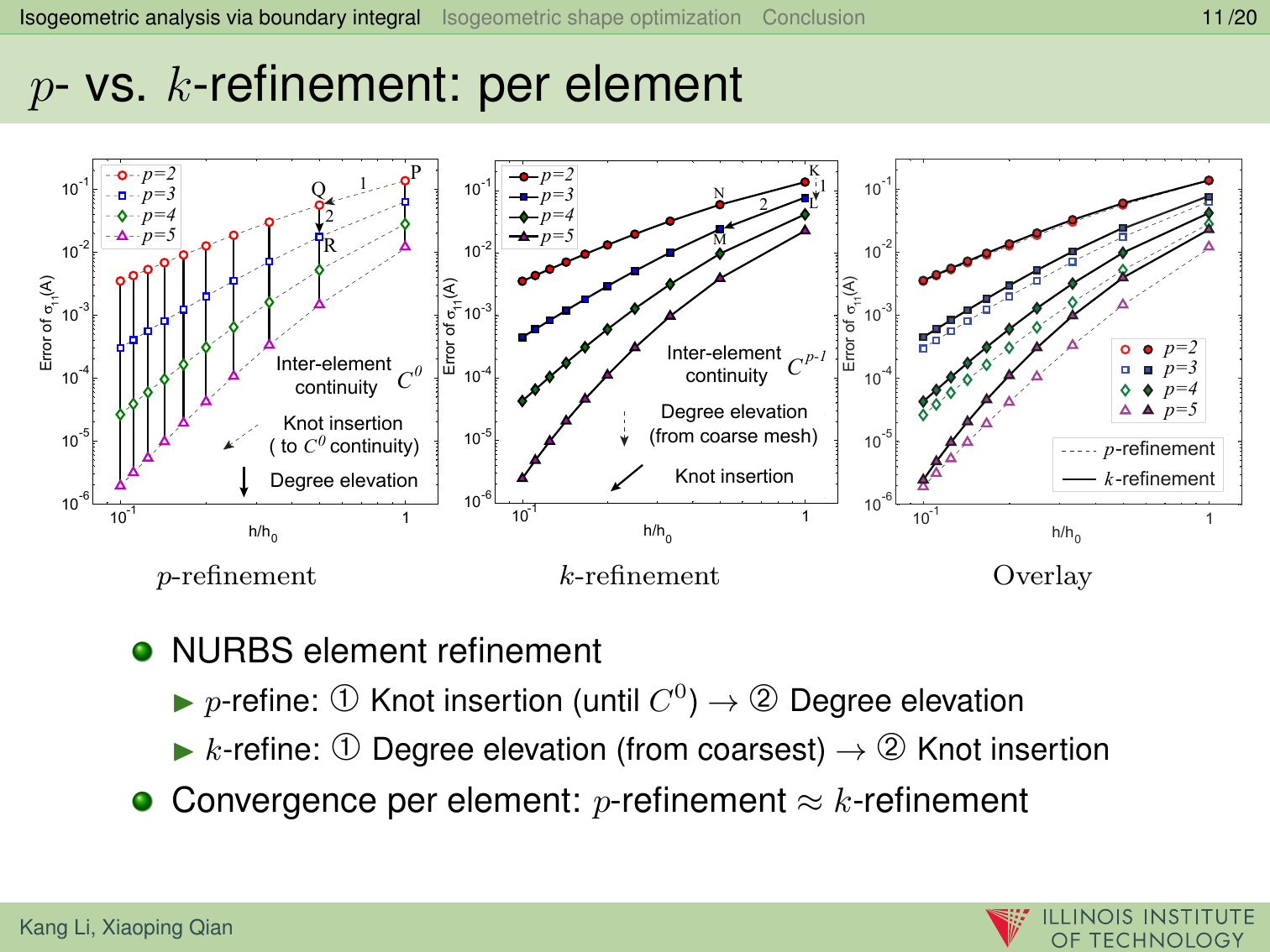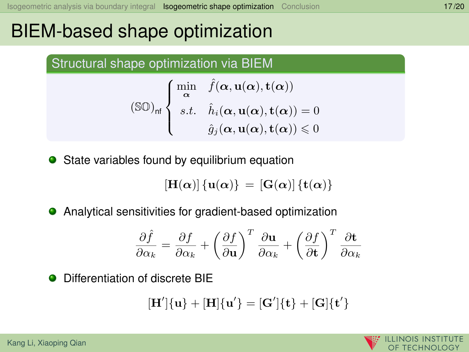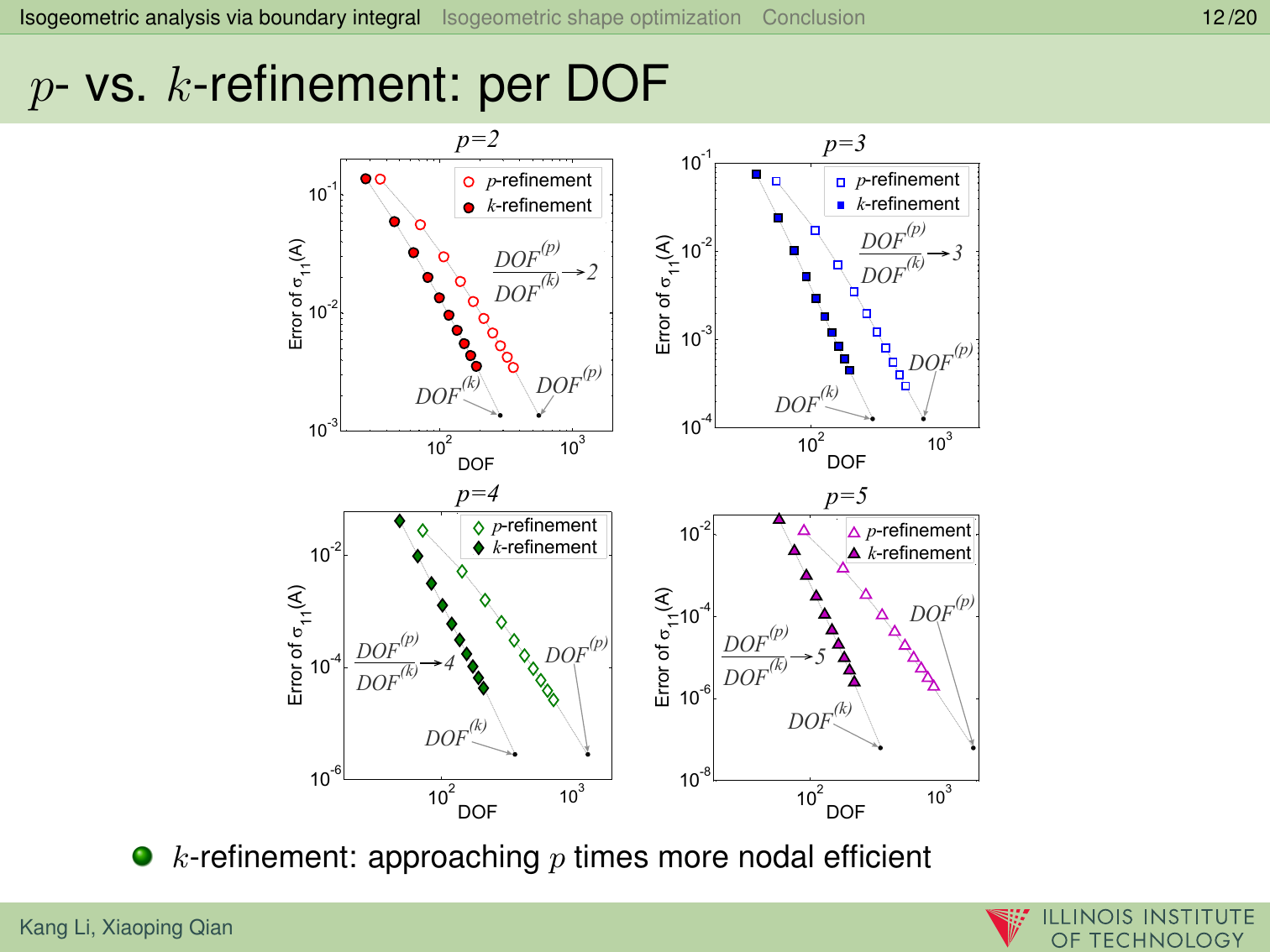 如上图所示,文中提出的基于边界积分公式(Boundary Integral Equation 或 BIE)的等几何分析方法(IsoGeometric Analysis 或 IGA)用于求解轴向承重的连杆形状优化问题。模型的边界由22块NURBS曲面片构成,共划分为382个NURBS边界单元。在经过优化求解的22次迭代历之后,连杆体积达到最小值,同时所受最大应力也从510Mpa降至420Mpa。