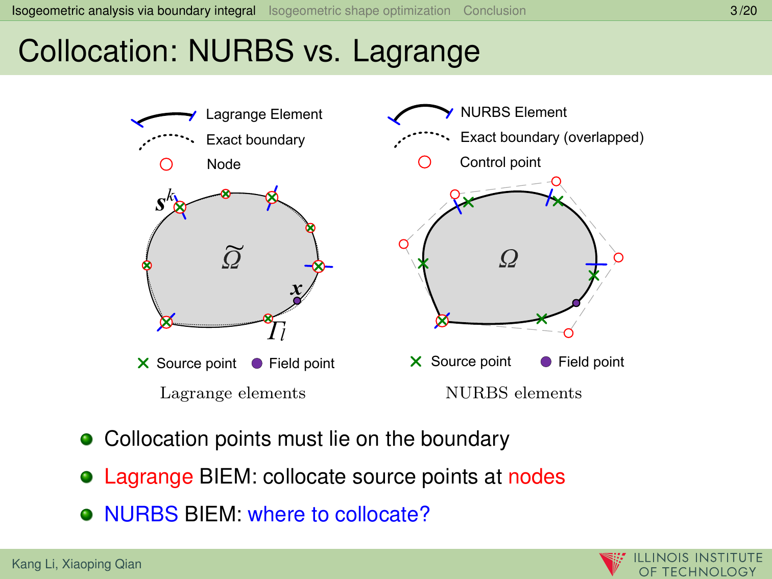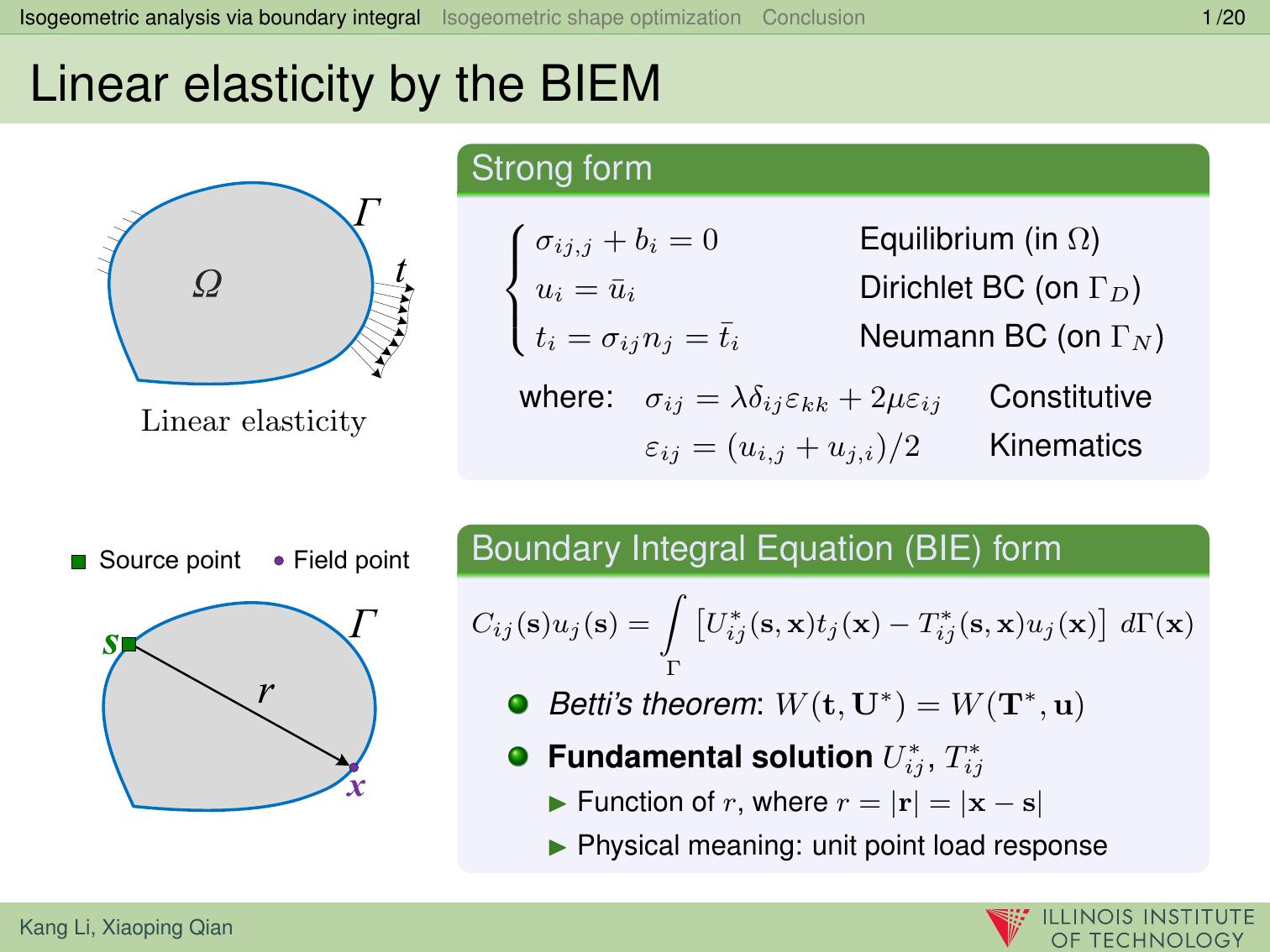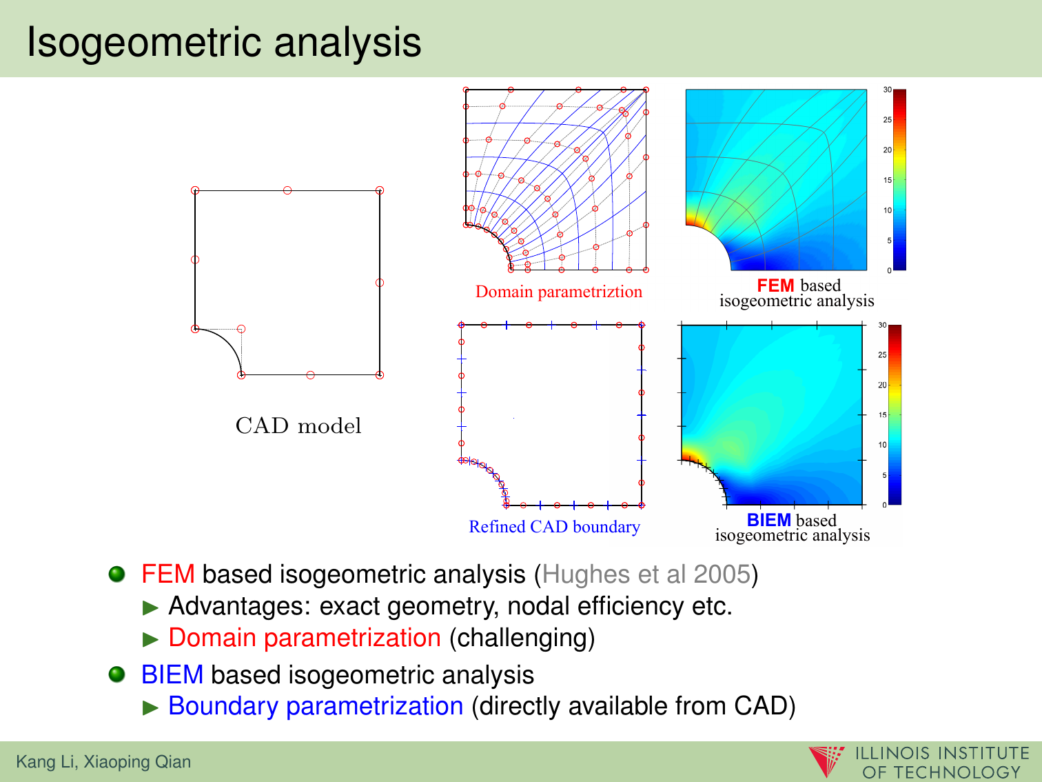 本论文提出了一种基于边界积分的等几何分析和形状优化方法。该方法通过边界积分公式法(Boundary Integral Equation Method 或 BIEM),使用同一个基函数来表达实体边界和拟合分析物理场,即非均匀有理样条(NURBS)基函数。我们提出将Greville坐标点作为边界配置点,并以线弹性问题进行了h型,p型和k型网格细分实验。实验显示Greville坐标点配置计算结果总体来说收敛性和稳定性都很好;与线性B样条相比,有理B样条形状函数拟合求解空间,分析收敛性并未获得显著改善。为了进行形状优化,我们用NURBS对实体边界参数化,并且提出了一种基于梯度导数的优化方法,并推导出了目标函数和约束函数相对于NURBS控制点位置灵敏度的解析公式。两个工程实例展示了基于边界积分的等几何分析和形状优化方法十分有效,并具备以下优点:1)基于NURBS的边界积分,和传统拉格朗日多项式基函数比,收敛性具有显著优势;2)省去了等几何分析优化中的一大瓶颈:实体内部参数化的过程;3)由于输入几何和输出分析模型使用同一NURBS数据,因为使CAD和分析的结合更加紧密。