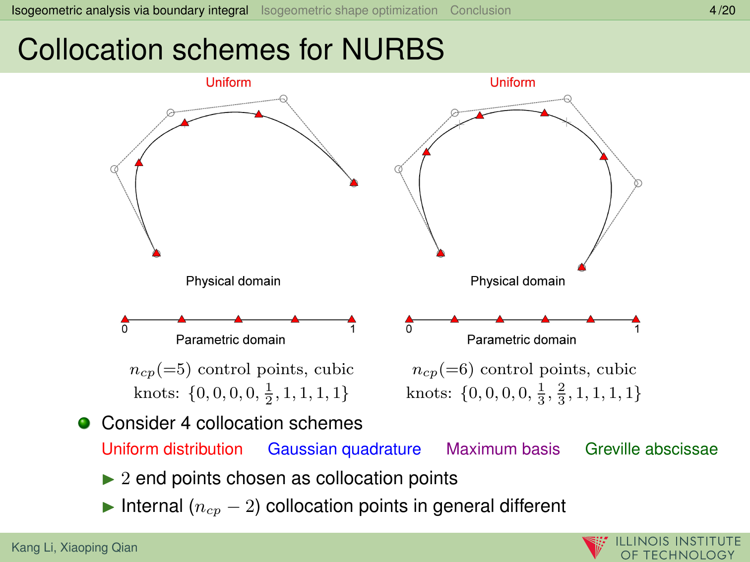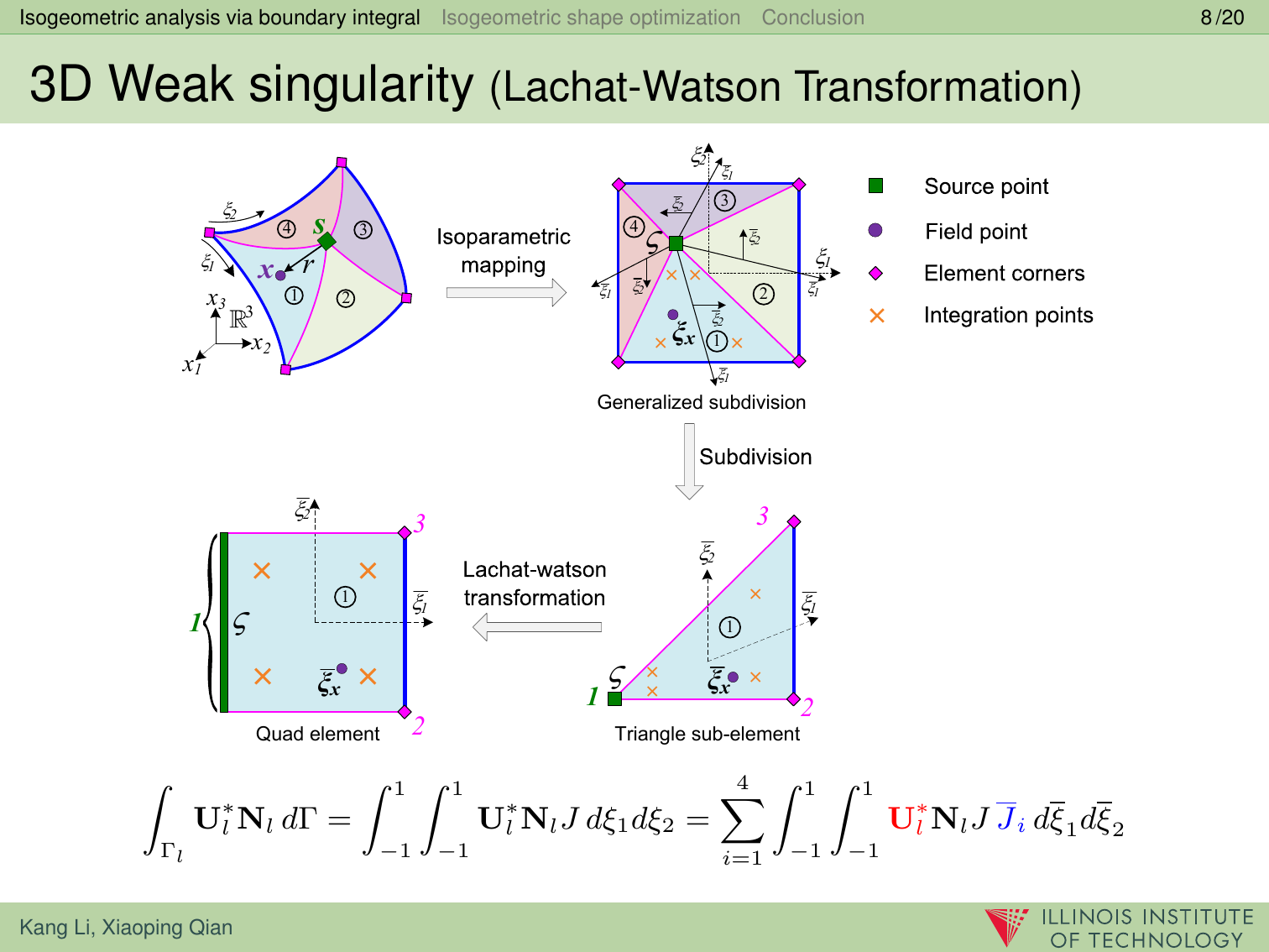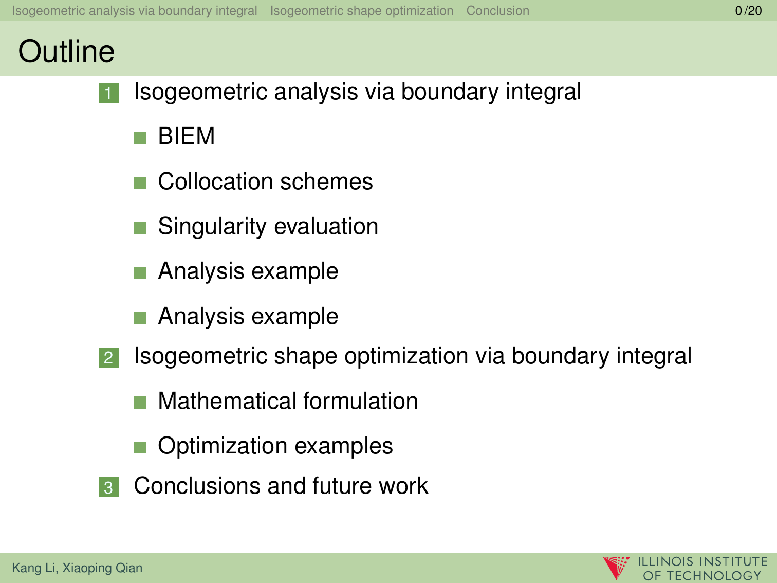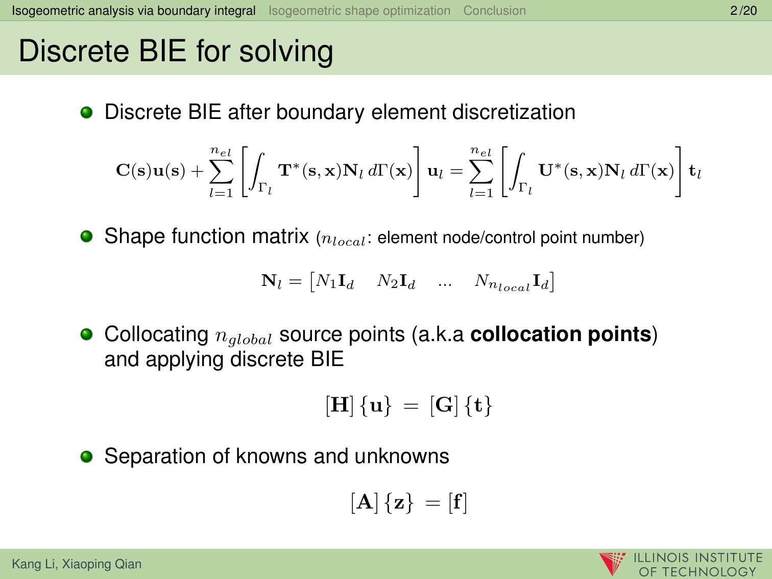 本论文提出了一种基于边界积分的等几何分析和形状优化方法。该方法通过边界积分公式法(Boundary Integral Equation Method 或 BIEM),使用同一个基函数来表达实体边界和拟合分析物理场,即非均匀有理样条(NURBS)基函数。我们提出将Greville坐标点作为边界配置点,并以线弹性问题进行了h型,p型和k型网格细分实验。实验显示Greville坐标点配置计算结果总体来说收敛性和稳定性都很好;与线性B样条相比,有理B样条形状函数拟合求解空间,分析收敛性并未获得显著改善。为了进行形状优化,我们用NURBS对实体边界参数化,并且提出了一种基于梯度导数的优化方法,并推导出了目标函数和约束函数相对于NURBS控制点位置灵敏度的解析公式。两个工程实例展示了基于边界积分的等几何分析和形状优化方法十分有效,并具备以下优点:1)基于NURBS的边界积分,和传统拉格朗日多项式基函数比,收敛性具有显著优势;2)省去了等几何分析优化中的一大瓶颈:实体内部参数化的过程;3)由于输入几何和输出分析模型使用同一NURBS数据,因为使CAD和分析的结合更加紧密。
